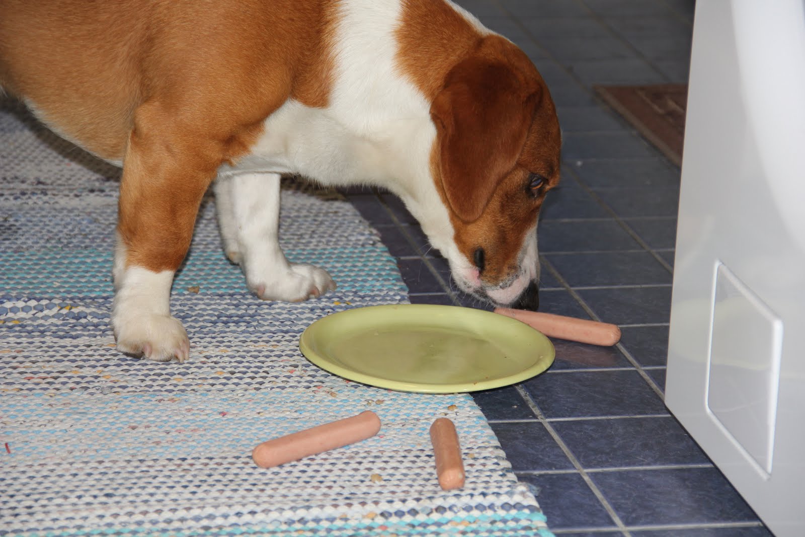 Kun nakit jäivät lautaselle, se vielä puhdisti ne huolella. Sitten piti vähän leikkiä nakeilla, hypellä edestakaisin, heitellä niitä ja sen sellaista!